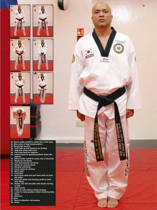 When doing this form it is important to ensure that you have symmetry and balance in techniques so that left and right side techniques are shown as mirror images. Visualisation of a real fight should be utilized when performing Poomsae. Attack and defence should be executed to centre line of your body. Please remember that defence is angular and circular. Attack is direct and straight. Power generation and force at deliverance of technique is generated by mass times acceleration and we are looking at being relaxed with tightening of core muscle groups occurring at the moment of impact.